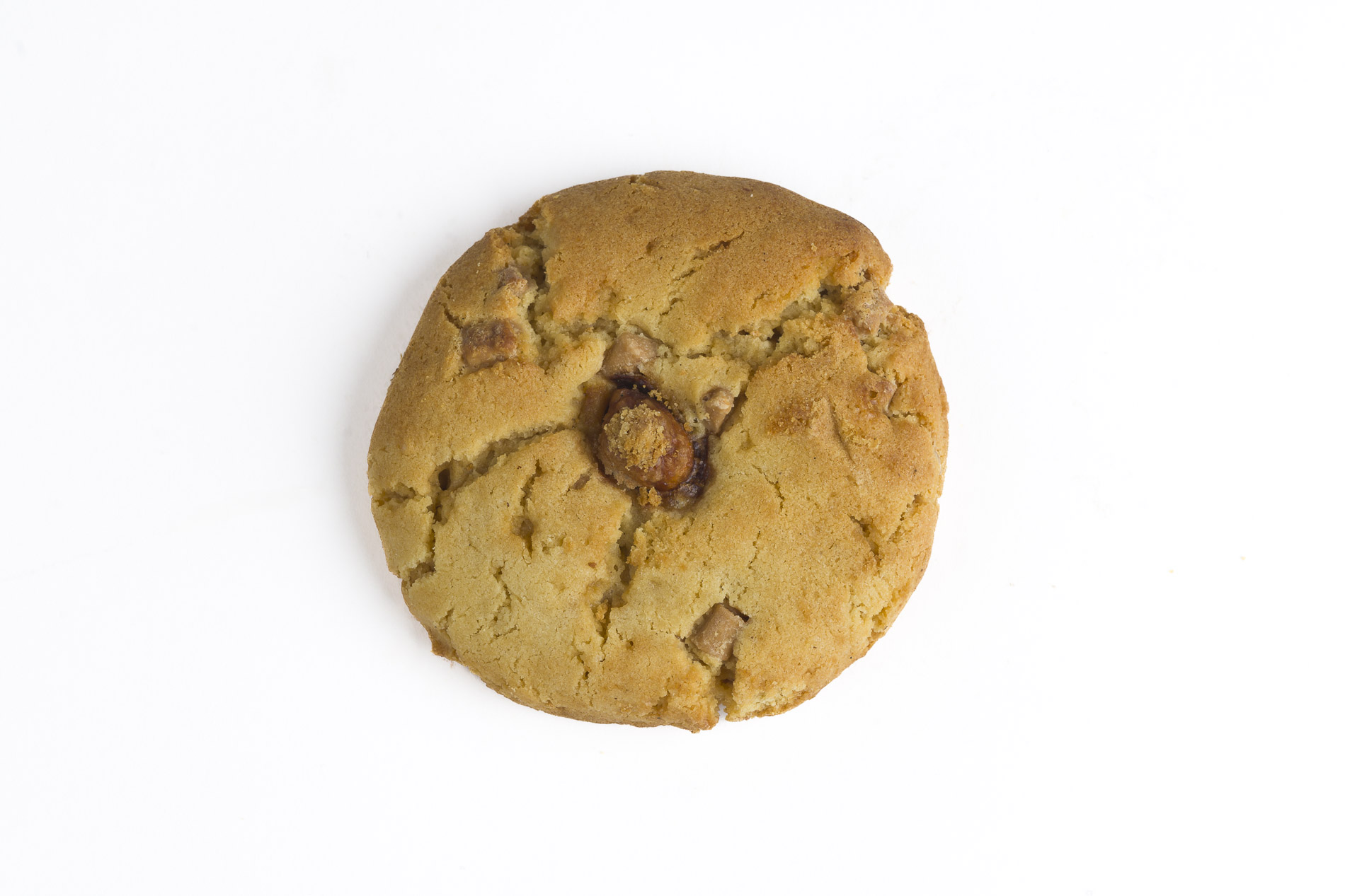 Ingredientes: harina de arroz, margarina (SOJA), azúcar, panela, almidón de maíz, almidón de tapioca, chunks de chocolate caramelo(LECHE), HUEVO, rellena de caramelo salado, goma xantana, CACAHUETE garrapiñado, impulsor, pasta de vainilla, sal.