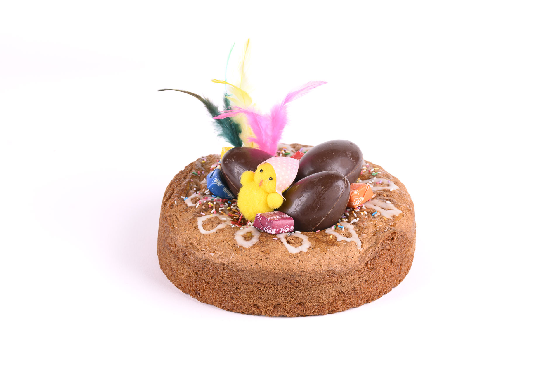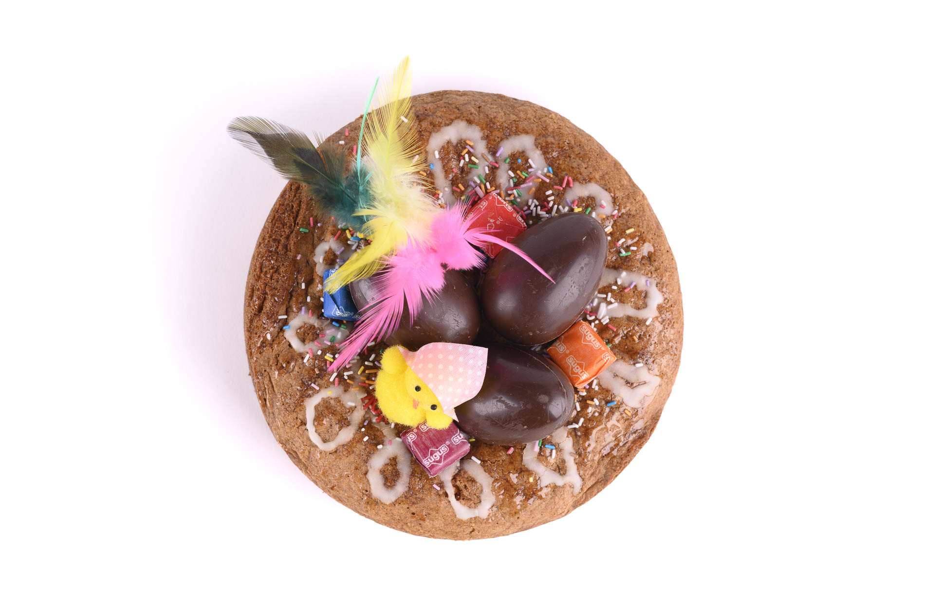 Decoración: brillo neutro, fideos de colores, sugus, huevo de chocolate negro.